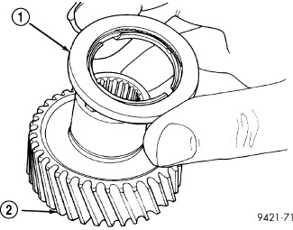 NOTE: The number seven needle (1) bearing has three anti-reversal tabs and is common with the number five and number two position. The orientation should allow the bearing to seat flat against the rear sun gear. A small amount of petrolatum can be used to hold the bearing to the rear sun gear (2).