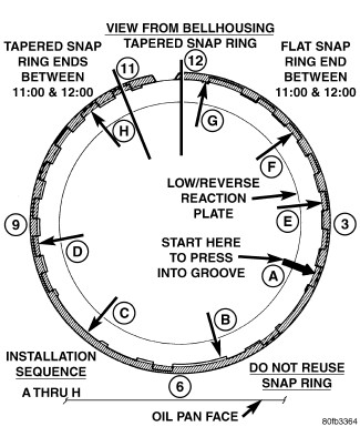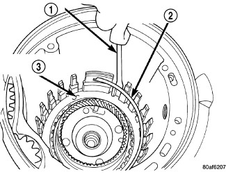 41. Install low/reverse reaction plate flat snap ring (2) insure you do not scratch clutch plate (3).
