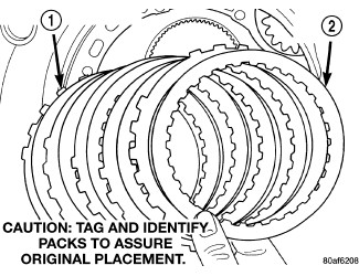 40. Install low/reverse clutch pack (1,2). Leave uppermost disc out until snap ring is installed.