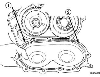 38. Install a bead of Mopar(R) ATF RTV (MS-GF41) (2) to transfer gear cover (1).