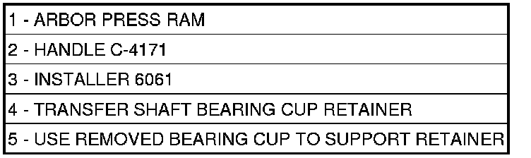 30. Using an arbor press (1) install transfer shaft bearing cup into retainer using Installer 6061(3). Use removed bearing cup to support retainer (4).