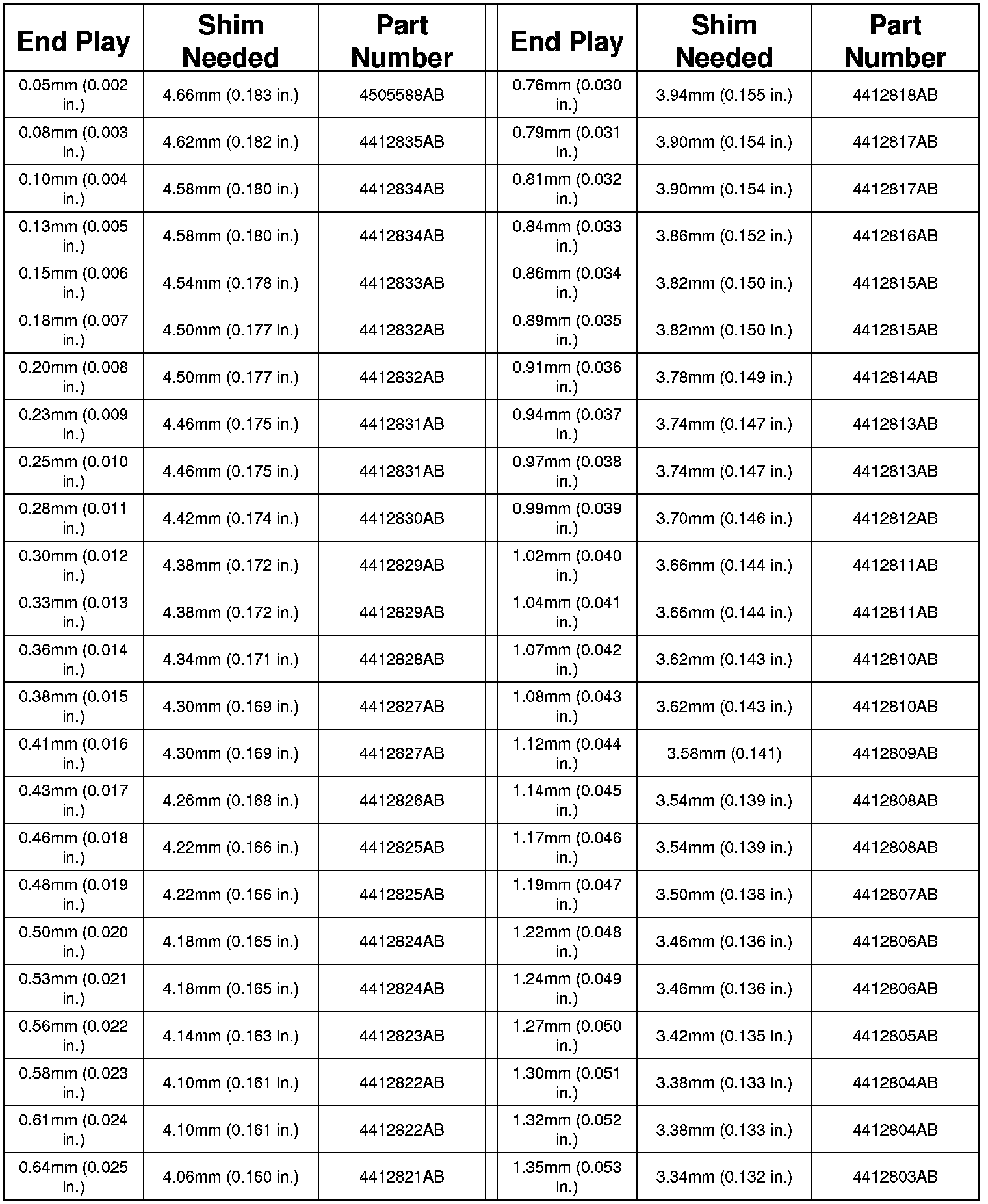 TRANSFER SHAFT BEARING SHIM CHART
