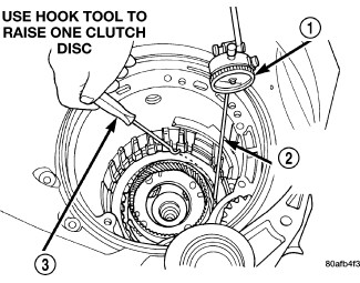 52. Set up dial indicator (1) and measure 2/4 clutch clearance. Press down on clutch pack with finger and zero dial indicator. 2/4 clutch pack clearance is 0.76-2.64 mm (0.030-0.104 in.). Set up indicator and record measurement in four (4) places. Take average of readings. If clearance is outside this range, the clutch is assembled improperly. There is no adjustment for 2/4 clutch clearance.