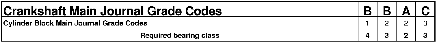 The grade marks for the crankshaft are located on the rearmost crankshaft counter weight. The crankshaft journal grade marks (A, B, or C) are read left to right, corresponding with journal number 1, 2, 3, 4. For an example, if the main bore grade on the side of the engine block is 3 and the journal grade on the #9 counterweight of the crankshaft is B, the proper select fit bearing would be a (2) +0.003 mm (+0.0001 in.).
