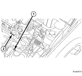 28. Disconnect the positive auxiliary battery post cable (2) from the left shock tower and position aside.