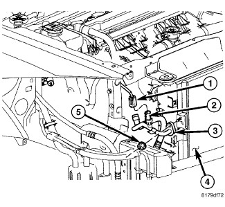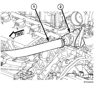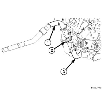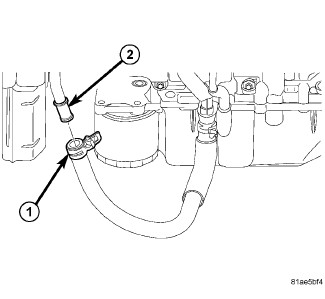 21. Disconnect the Lower Coolant Hose (1) from the return tube (2).