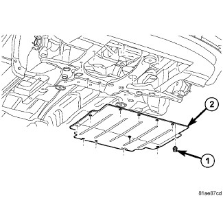10. Remove the 12 belly pan fasteners (1) and remove the belly pan (2).