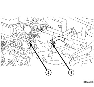 30. Disconnect the heater core supply hose (1) from the intake manifold outlet (2).