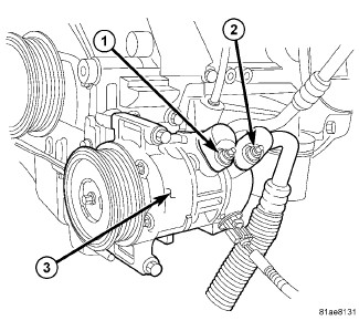 33. Disconnect both A/C lines (1) and (2) from the A/C compressor (3).