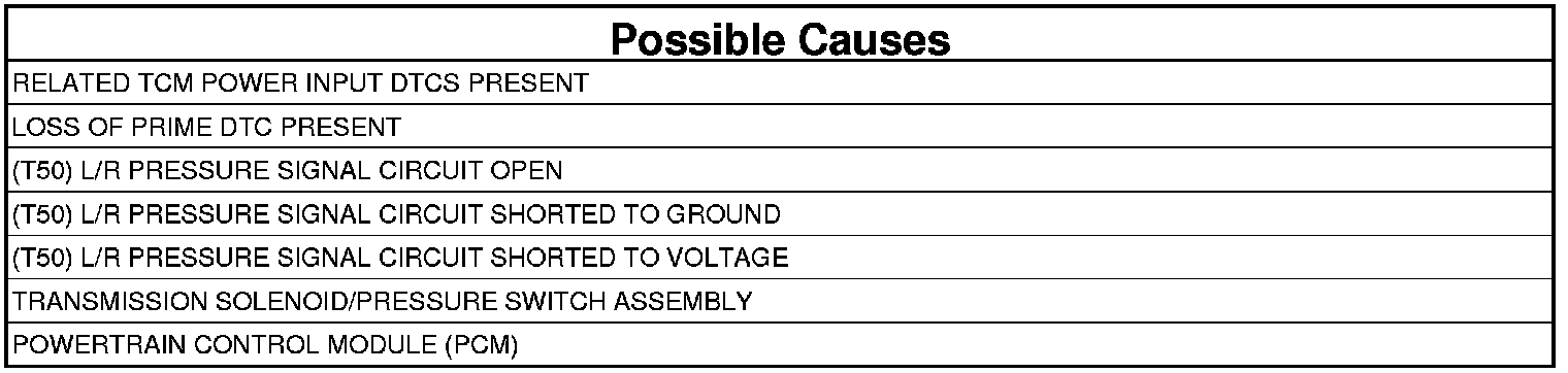 The DTC is set if the L/R pressure switch is open or closed at the wrong time in a given gear. If the problem is identified for three successive key starts, the transmission will go into Limp-in mode and the MIL will turn on after 10 seconds of vehicle operation.