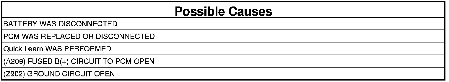Note: This is not a fault code. It exists to provide reference information only. A battery backed RAM is used to maintain some learned values. When the battery is disconnected, this memory is lost. When the battery is reconnected, the loss of learned values will be detected by the controller. The code will be set and the learned values will be initialized to known constants and the learning process will continue. Setting the code has no effect except for re-initialization of learned values.