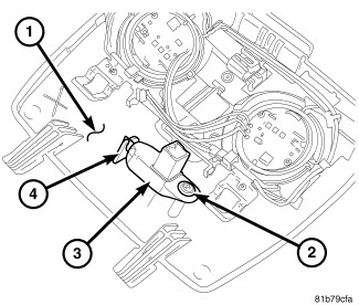 1. Position the infrared sensor (3) onto the back of the overhead console (1). Align the slot on the front of the sensor with the tabs (4) on the console.