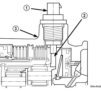 The Output Speed Sensor (1) provides information on how fast the output shaft is rotating. As the rear planetary carrier park pawl lugs pass by the sensor coil, an AC voltage is generated and sent to the PCM/TCM. The PCM/TCM interprets this information as output shaft rpm.