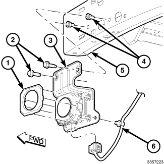 4. Engage the retainer that secures the Front End Module (FEM) wire harness (6) to the back of the bracket.