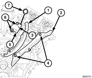 2. If removed, install the right side cam chain guide (1) and tensioner arm (6). Tighten attaching T30 bolts (2) to 12 Nm (106 in. lbs.).