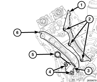 6. If removed, install the LH cam chain tensioner (5) to the cylinder head with two bolts (6). Tighten the T30 bolts (6) to 12 Nm (106 in. lbs.).