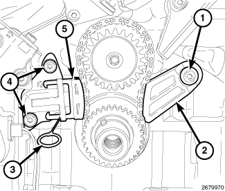 29. Install the oil pump chain tensioner (1). Insure that the spring (3) is positioned above the dowel pin (2).