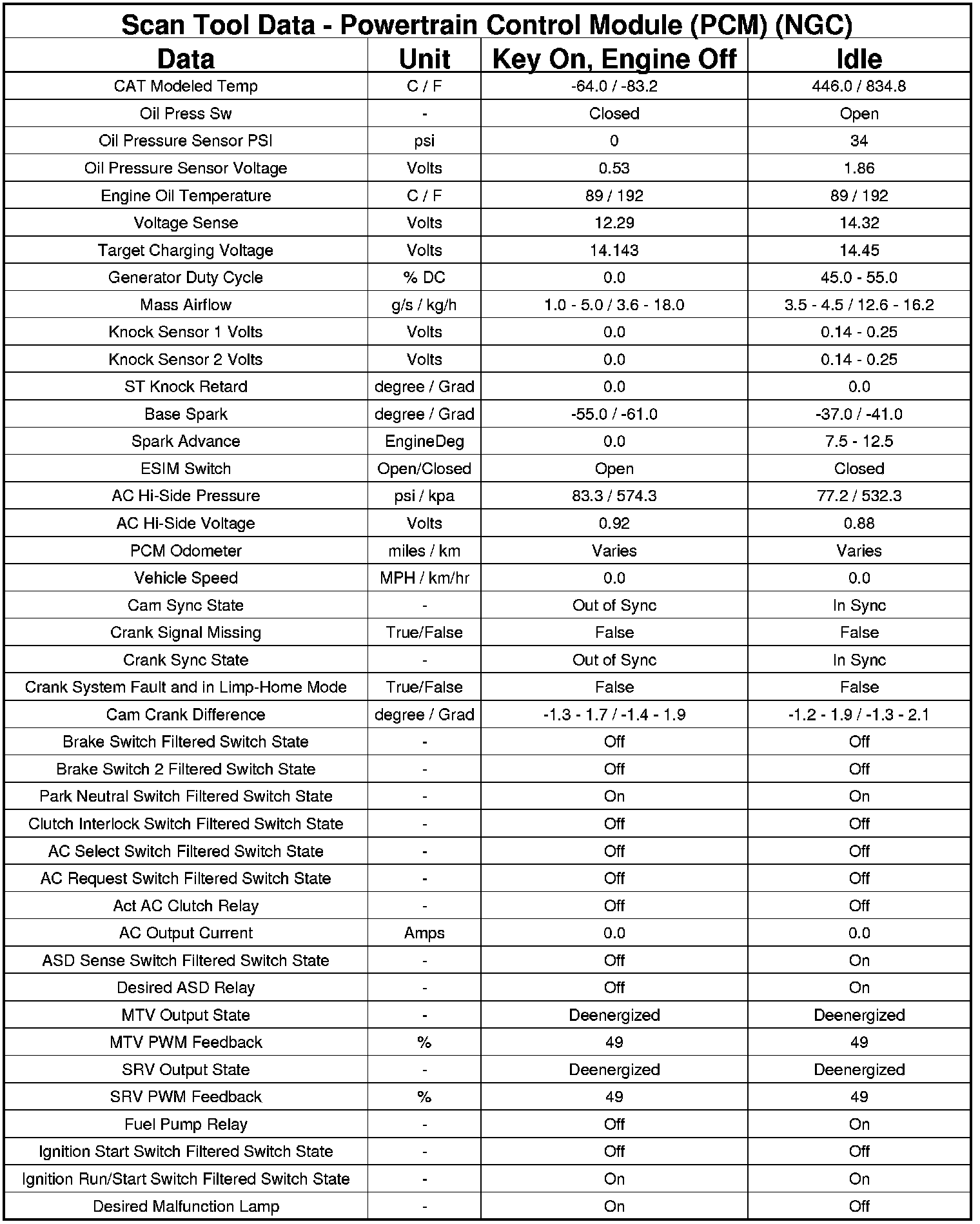 The following chart lists data values taken from the Scan Tool Powertrain Control Module (PCM) data list for the NGC controller. The values were taken at key on, engine off and at idle. The data is to be used for reference only.
