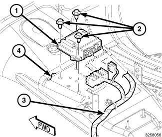 4. Remove the three screws (2) that secure the ORC to the top of the floor panel transmission tunnel.