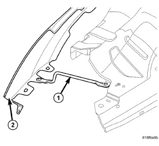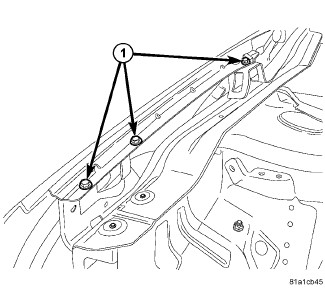 2. From inside engine compartment, start the center upper rail bolt. Install all the fasteners (1) attaching fender to upper rail and tighten.