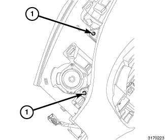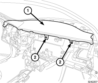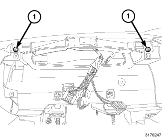 5. Install the two fasteners (1) located under the instrument cluster bezel securing the top pad to the base panel. Tighten the fasteners securely.