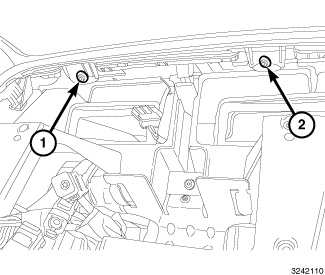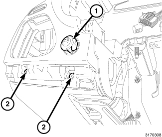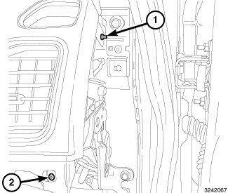 7. Install the two fasteners (1, 2) securing the lower pad to the I/P located on the passenger side.Tighten the fasteners securely.