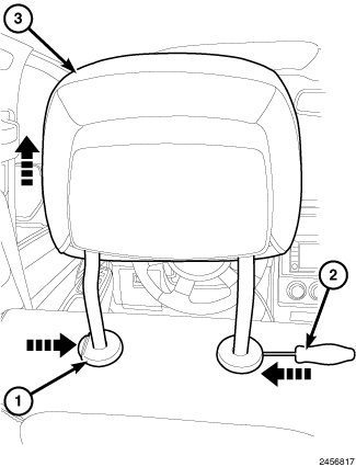 8. Using a thin wire type tool (2), press the hidden release button on the right side headrest slave sleeve.
