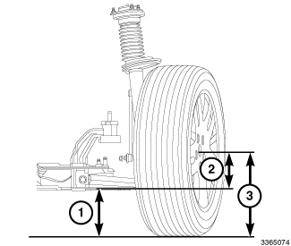 4. Subtract the pivot bolt height (1) from the spindle height (3) to obtain the curb height value (2). Compare the curb height value (2) to specifications listed in the following CURB HEIGHT SPECIFICATIONS chart. Maximum left-to-right differential is not to exceed 12 mm (0.5 in.).