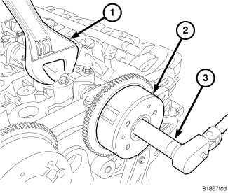2. Remove camshaft phaser (2) retaining bolt while holding the camshaft in place with a wrench (1) on the camshaft flats.