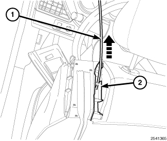 5. Disconnect the rear entry release cable from the release latch (2) and the mounting bracket (1).