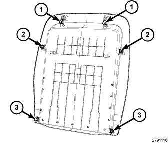 12. Install the seat back cover panel by locating and engaging the top spring retainers (1) first, then engage the remaining retainers (2 & 3) into the seat back ensuring all the retainers engage.