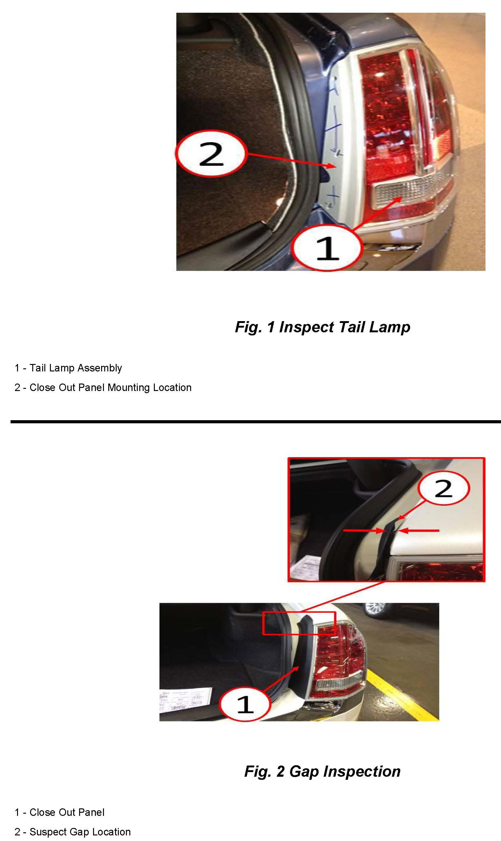 1. Inspect the right and left rear tail lamp, was the close out panel cover missing (Fig. 1) or have a gap greater than 2.5mm (1/8in) from the quarter panel to the cover (Fig. 2)?
