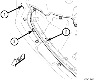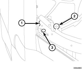 The headlamp vertical adjustment screws are accessed through funnel-like formations (2) integral to the back of each front lamp unit housing, located just rearward of the upper member of the headlamp mounting cross member (1). Export market vehicles have a second horizontal (right/left) adjustment screw (3) provided. The high beam pattern will be correct when the low beams are properly aimed.