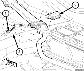3. Disconnect the body wire harness connector (1) from the Low Frequency (LF) antenna (2) connector receptacle.