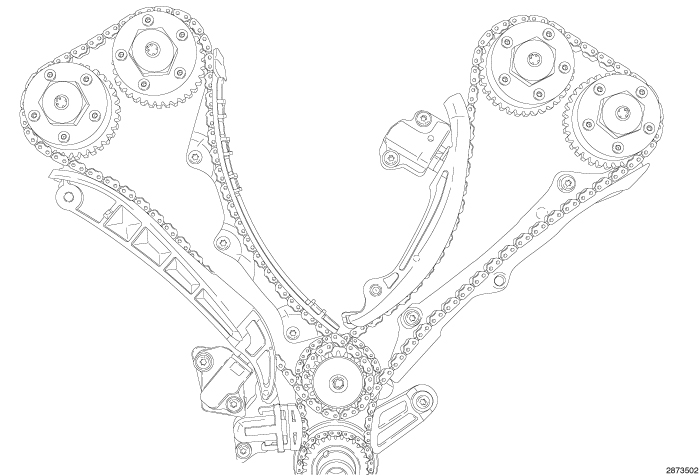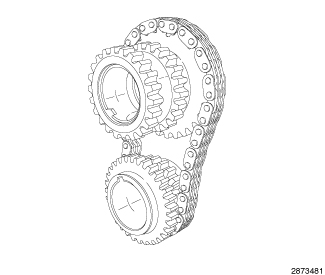 The primary timing chain is a silent type. The primary chain drives the 28 tooth idler sprocket directly from a 21 tooth crankshaft sprocket. This results in a 75% speed reduction to the idler sprocket. The idler sprocket assembly connects the primary chain drive and the secondary chain drive. The idler sprocket assembly consists of two integral 22 tooth sprockets a 28 tooth sprocket. The idler sprocket assembly spins on a stationary idler shaft. The idler shaft is a light press-fit into the cylinder block. A large washer on the idler shaft bolt and the rear flange of the idler shaft are used to control sprocket thrust movement. Pressurized oil is routed through the center of the idler shaft to provide lubrication for the bushings used in the idler sprocket assembly. Primary chain motion is controlled by a hydraulic oil damped tensioner and a fixed guide. The tensioner and the guide both use nylon plastic wear faces for low friction and long wear. The primary chain receives oil splash lubrication.