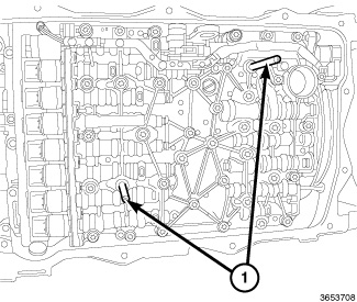 60. Using the valve body alignment pins (1) to guide, position the valve body assembly to the transmission.
