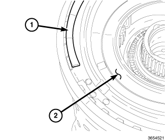 8. Install the snap ring (1) into the P4 sun gear/C/E clutch retainer (2).