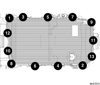 70. Install the thirteen oil pan retaining bolts and using the sequence shown and tighten to 10 Nm (89 in. lbs.).
