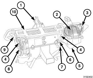 All vehicles are equipped with a common front Dual Zone HVAC housing (1). The heating and A/C system combines heating, ventilating and A/C capabilities into a single unit mounted within the passenger compartment, behind the instrument panel. The HVAC housing includes: