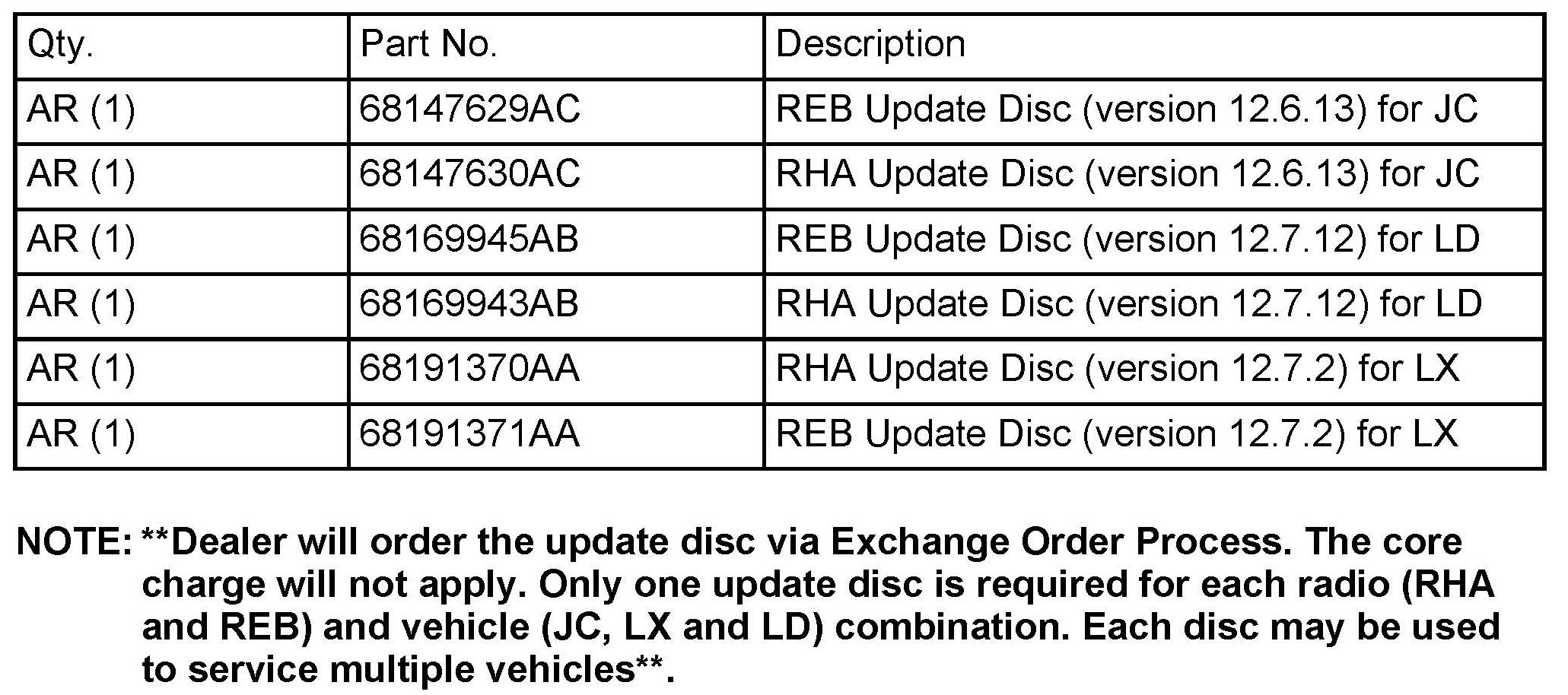 This bulletin applies to JC vehicles built between May 1, 2011 (MDH 0501XX) and March 22, 2012 (MDH 0322XX). LD/LX vehicles built between May 1, 2011 (MDH 0501XX) and March 27, 2012 (MDH 0327XX) that are equipped with UCONNECT TOUCH 4.3 CD/MP3 (sales code RHA) or UCONNECT TOUCH 4.3S CD/MP3/SAT (sales code REB).