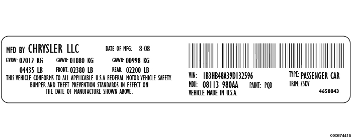 A vehicle certification label is attached to every Chrysler LLC vehicle. The label certifies that the vehicle conforms to all applicable Federal Motor Vehicle Standards. The label also lists: