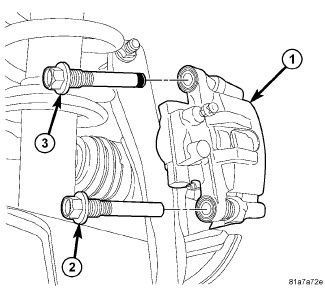 When installing the caliper guide pin bolts (2, 3) make sure that the one (3) that has a special sleeve on the end is installed in the upper mounting hole.