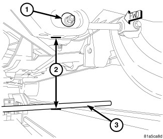 5. REAR - On each side of the vehicle, measure and record the distance (2) from the flat surface below the rear toe adjustment cam bolt (1) to the floor or alignment rack/lift runway surface. It may be necessary to measure to the bottom of a straight edge (3), placed from lift runway to runway, to get an accurate measurement.
