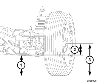7. REAR - Subtract the mounting bolt height (1) (found in 5 ) from the spindle height (3) to obtain the curb height value (2). Compare the curb height value (2) to specifications listed in the following CURB HEIGHT SPECIFICATIONS chart. Maximum left-to-right differential is not to exceed 12 mm (0.5 in.).