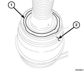Any time the outer tie rod end is disconnected from the knuckle, before assembly, clean all old grease and debris from the boot with a clean cloth and apply outer tie rod grease P/N 68088623AA (1) to the boot (2) as shown.
