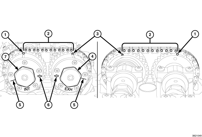 - There are twelve chain pins (2) BETWEEN the exhaust cam phaser triangle marking (1) and the intake cam phaser circle marking (3).
