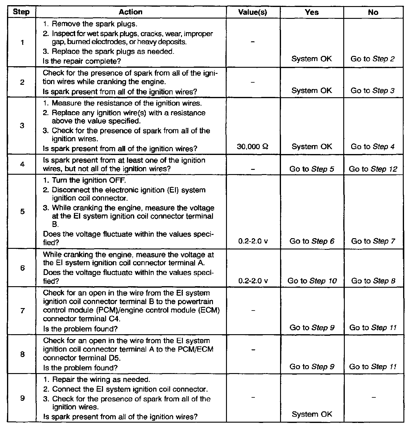 6. After confirming PCM/ECM inputs for the electronic spark timing to the EI system ignition coil are OK, it can be determined that a faulty EI system ignition coil is at fault.