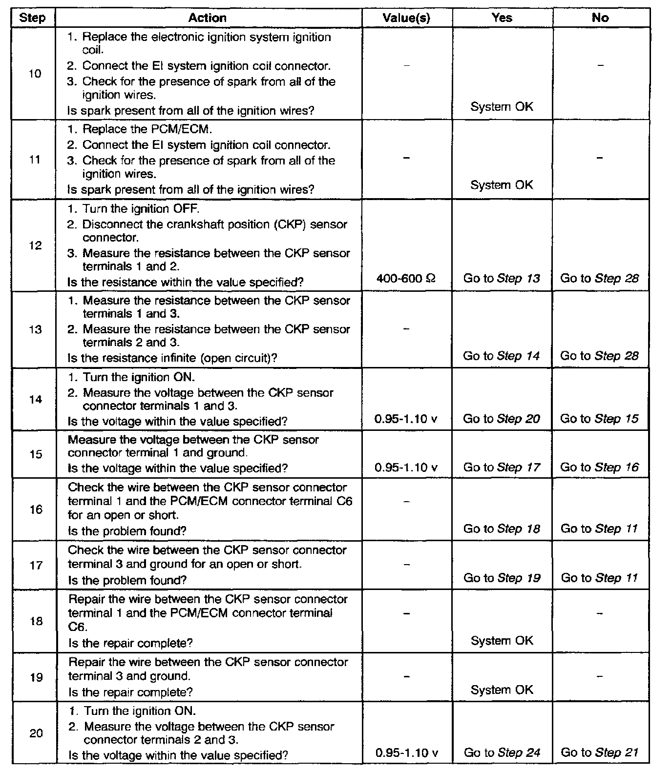 11. After confirming proper CKP sensor inputs to the PCM/ECM and no wiring problems present it can be determined that the PCM/ECM is at fault.