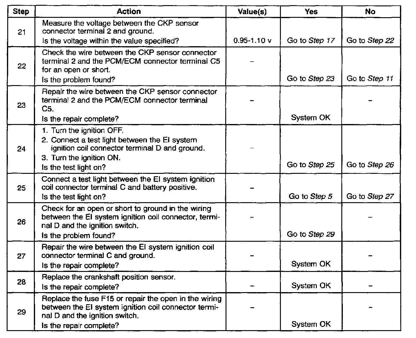 24. This step, along with step 25, checks for battery voltage and a ground to the EI system ignition coil.