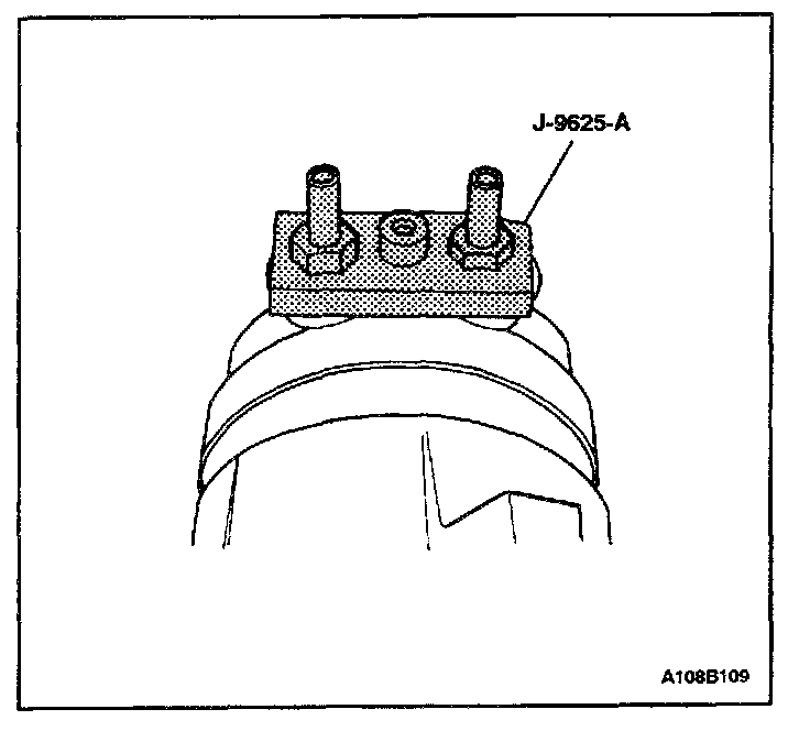 8. Disconnect both gauge hoses. Remove the pressure testing connector J-9625-A.